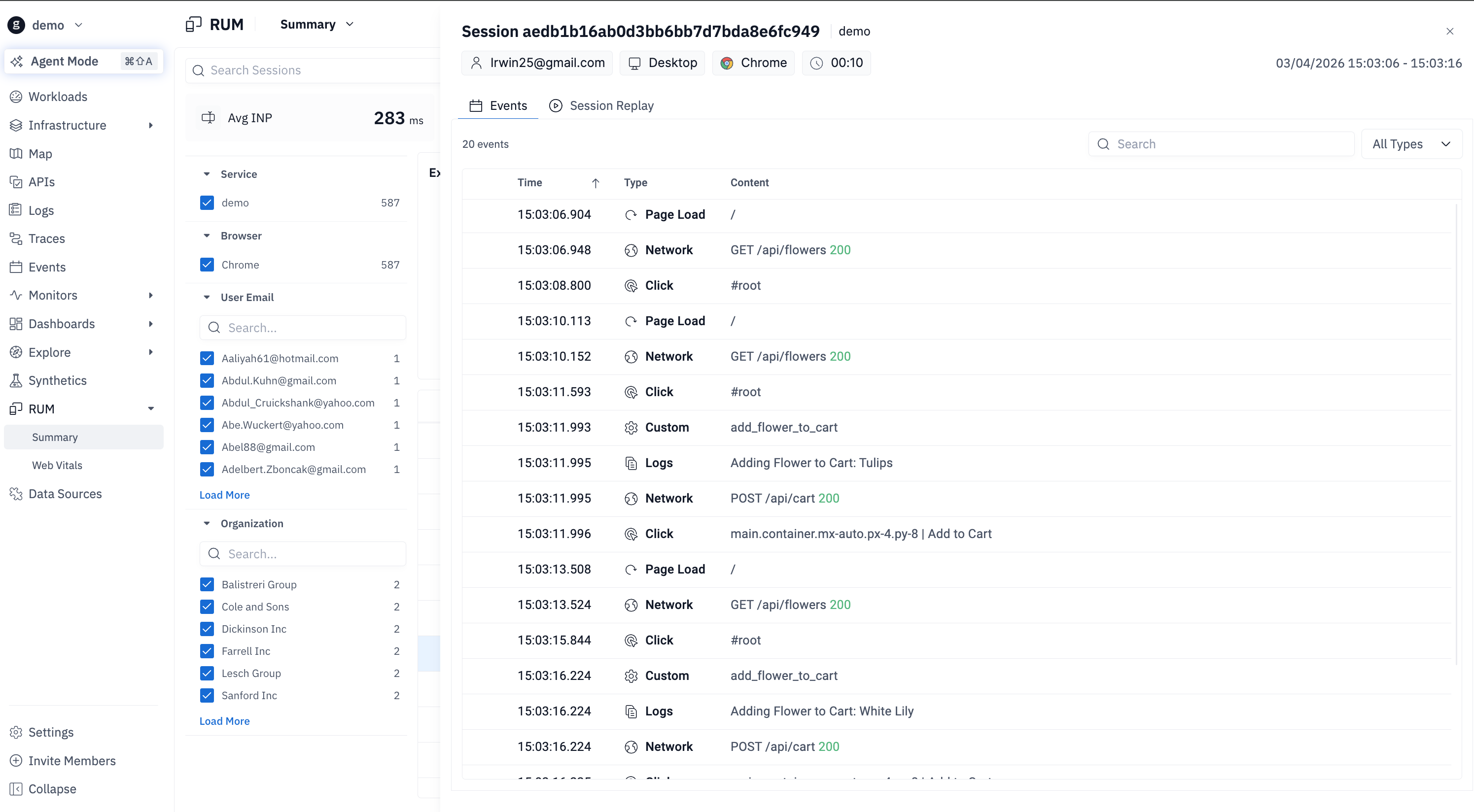 * **Understand the user experience** - capture every interaction, page load, and performance metric from the end-user perspective to pinpoint front-end issues in real time. View sessions with session recording and navigate from an event to the relevant timestamp in the replay.